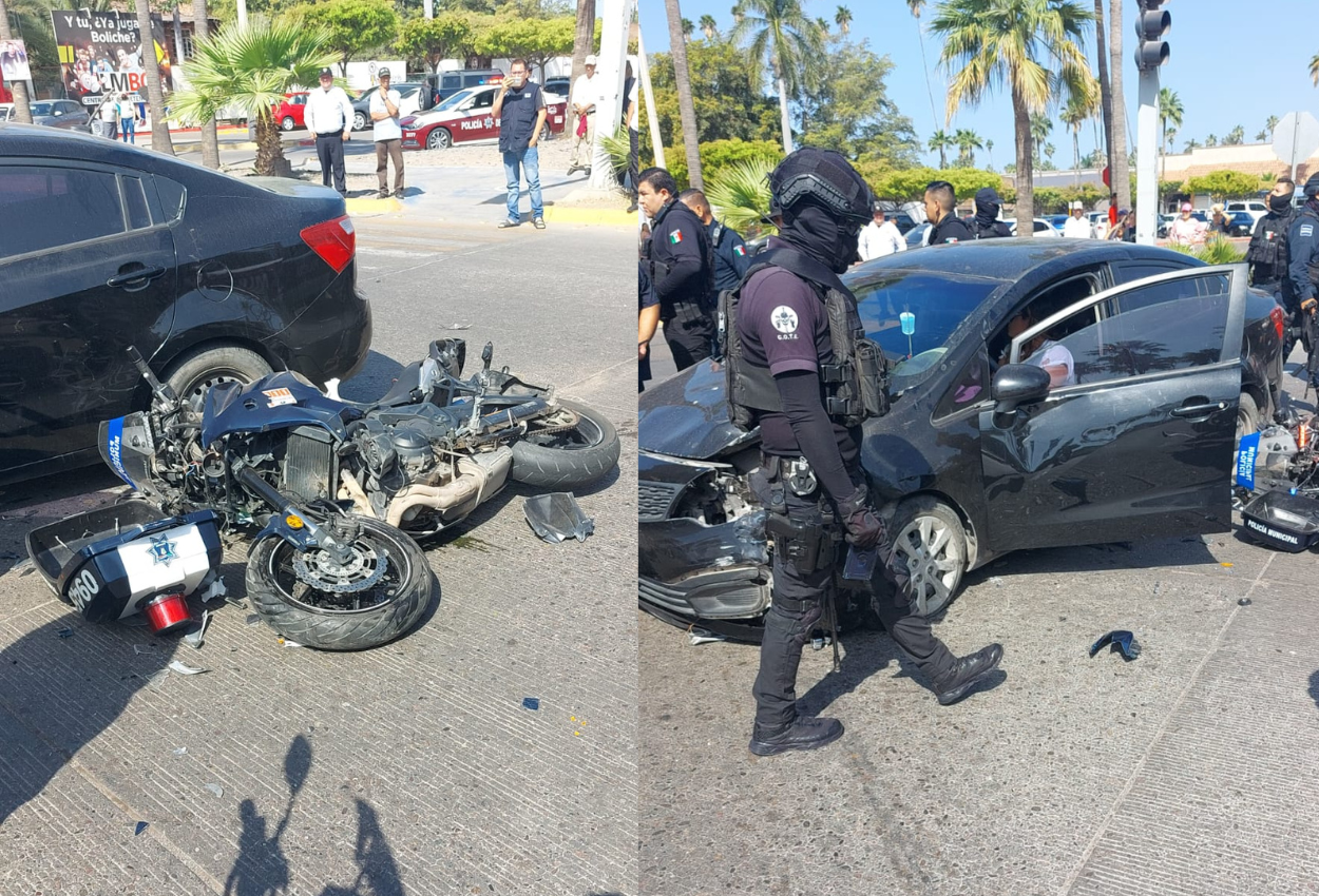 Los Mochis, Sinaloa.- La mañana de este miércoles se registró un accidente vial donde un elemento de la Policía Municipal que conducía una motocicleta de la unidad oficial resultó con lesiones luego de ser impactado y arrollado por un vehículo tipo sedan.