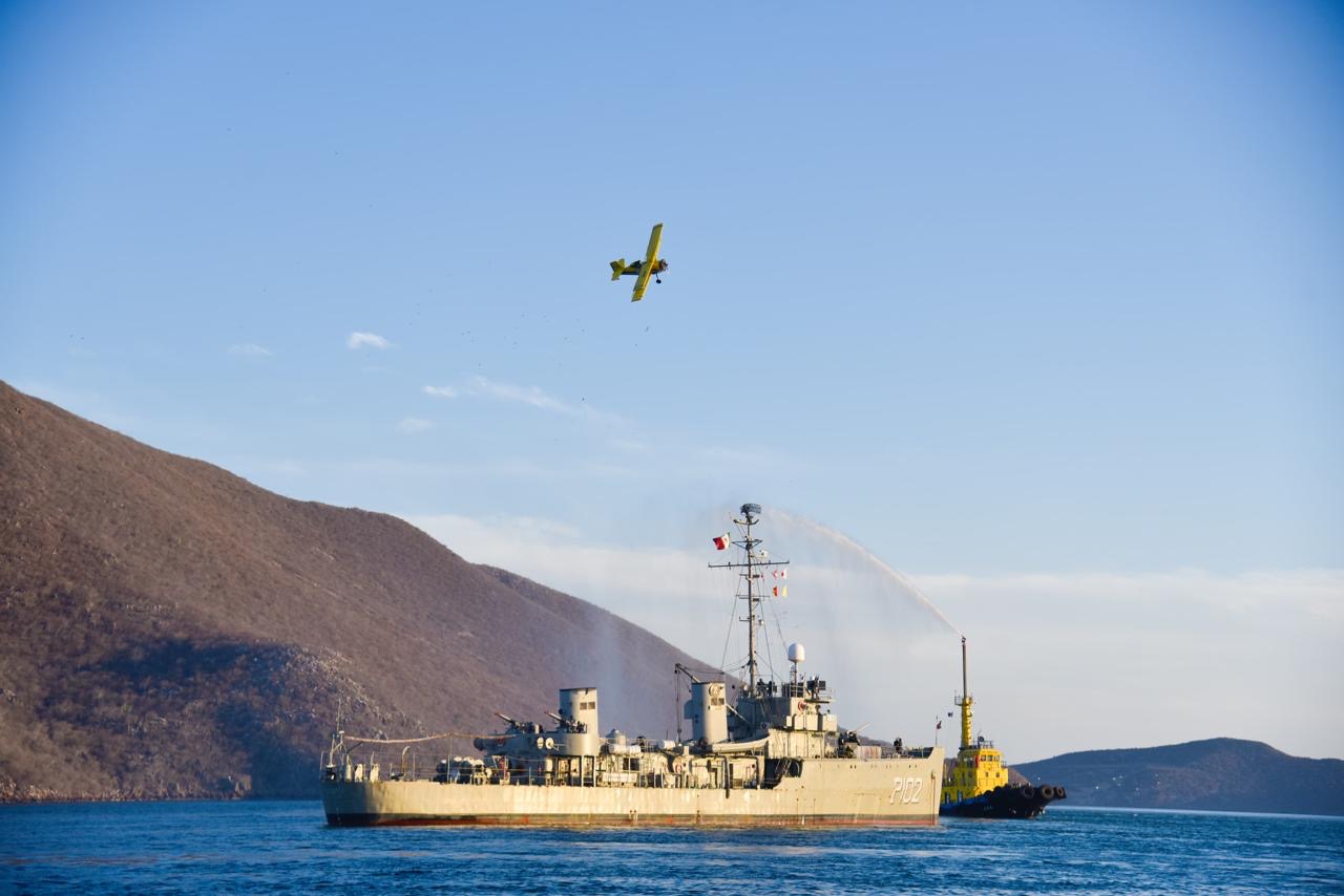 Puerto de Topolobampo, Ahome, Sinaloa. A 14 de Abril del 2025.- Miles de personas, en su mayoría familias completas, provenientes de la zona norte, centro y sur del estado disfrutaron del simulacro del 111 aniversario del Primer Combate Aeronaval del Mundo, en la hermosa bahía de Topolobampo.