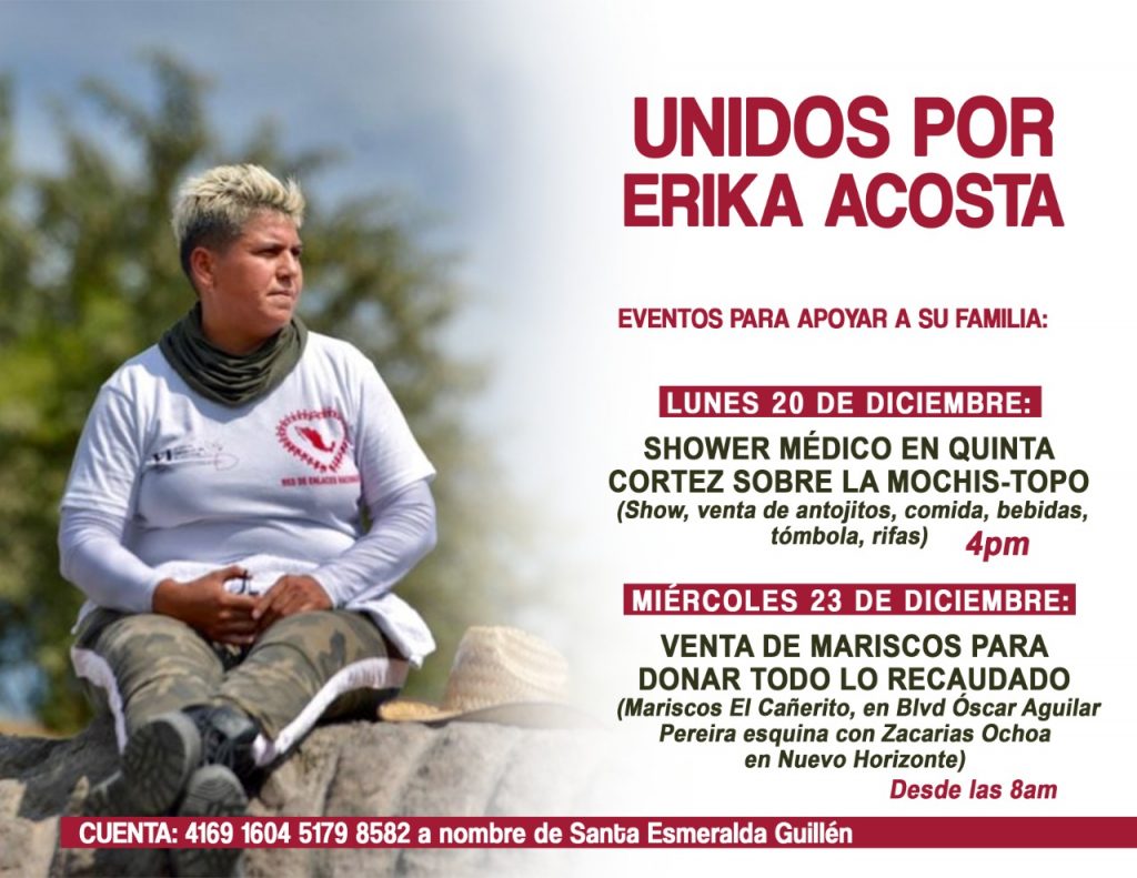 «El miércoles 23 de diciembre se realizará una venta a partir de las 8 de la mañana en Mariscos El Cañerito, ubicado en el Bulevar Óscar Aguilar Pereira del Nuevo Horizonte, la venta total de ese día será donado para Erika Acosta» Comentó Viviana Padilla