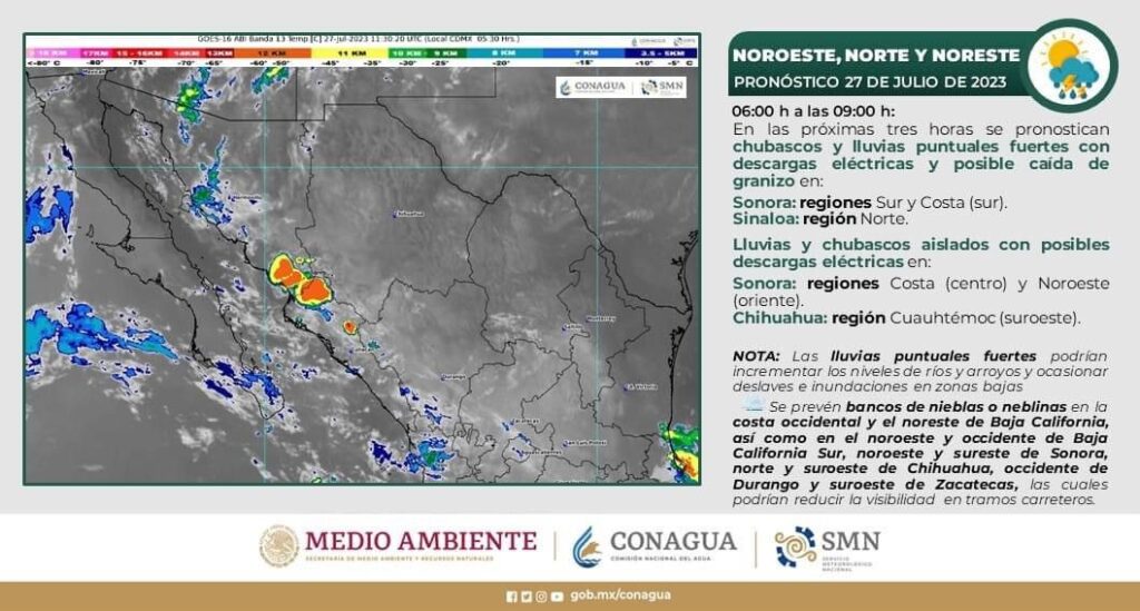 Sinaloa.- El Servicio Meteorológico Nacional (SMN) ha pronosticado lluvia y calor para el norte de Sinaloa este jueves. Se esperan chubascos y lluvias puntuales muy fuertes, aproximadamente 75 milímetros, durante la mañana, mientras que el día será extremadamente caluroso. Estas precipitaciones vendrán acompañadas de descargas eléctricas y podrían incluir la caída de granizo.