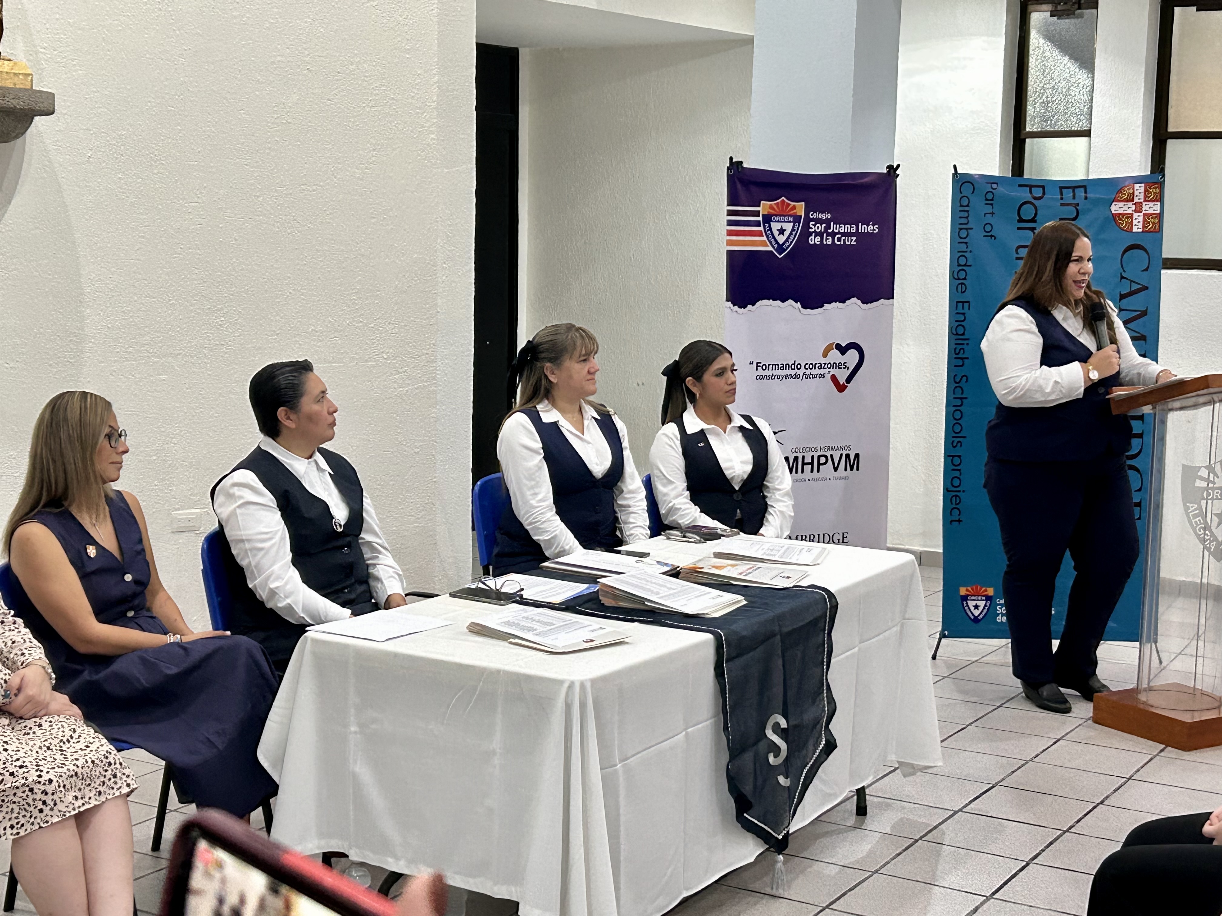 Los Mochis, Sinaloa.- La directora general Hermana María Alejandra Barajas Lozoya junto a las directoras de secundaria Teresita Becerra y de preparatoria Carmen Magallanes hablaron de la importancia de este reconocimiento a nivel mundial y destacaron que el Colegio Sor Juana es la única Cambridge English School en Sinaloa, lo que permite a sus alumnos llevar el aprendizaje del inglés junto a su preparación académica