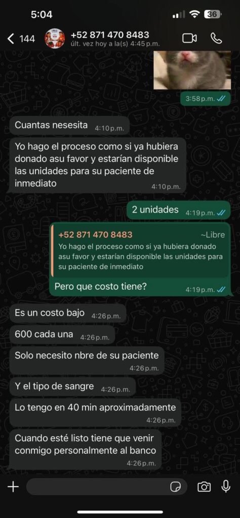 El presunto estafador ofreció “servicios” de donación de sangre a un precio menor al del mercado, fuera de todo protocolo y normativas sanitarias, poniendo en riesgo la salud y la integridad de las personas. Al percatarse de la posible estafa, el seguidor proporcionó información falsa para comprobar las intenciones de esta persona, quien posteriormente reaccionó con amenazas y agresiones.