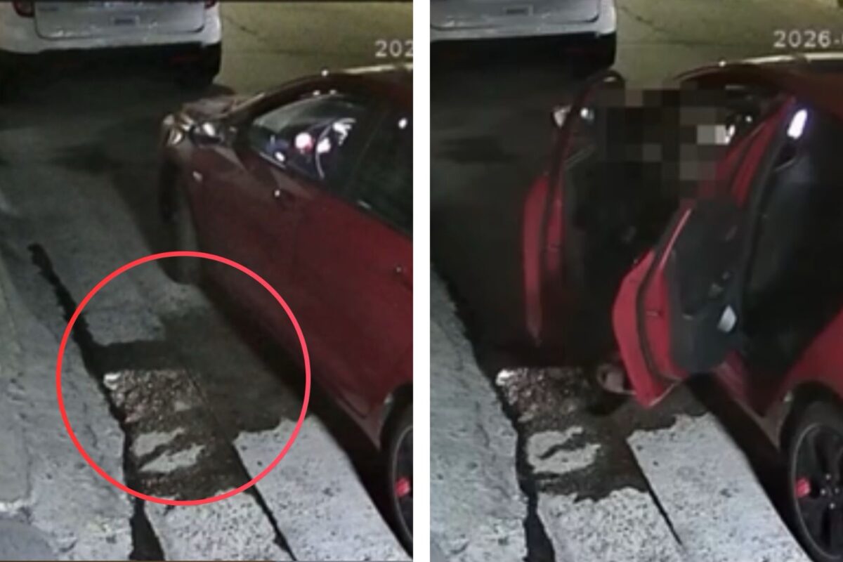 Según la denunciante, alrededor de las 22:00 horas, su cámara de videovigilancia captó el momento en que una mujer a bordo de un vehículo rojo tipo sedán se estaciona frente a la vivienda. Posteriormente, la conductora desciende parcialmente de la unidad y realiza sus necesidades fisiológicas sobre la banqueta del domicilio.