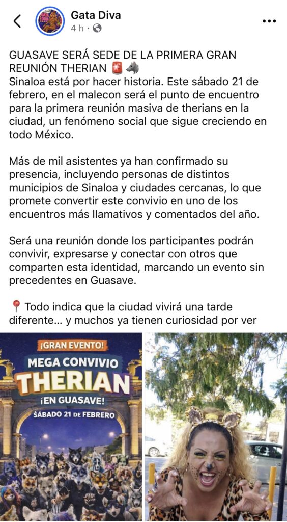 El evento, denominado “Mega Convivio Therian”, está programado para realizarse este sábado 21 de febrero en el malecón de la ciudad, donde se espera la asistencia de participantes provenientes de distintos municipios de Sinaloa y ciudades cercanas.