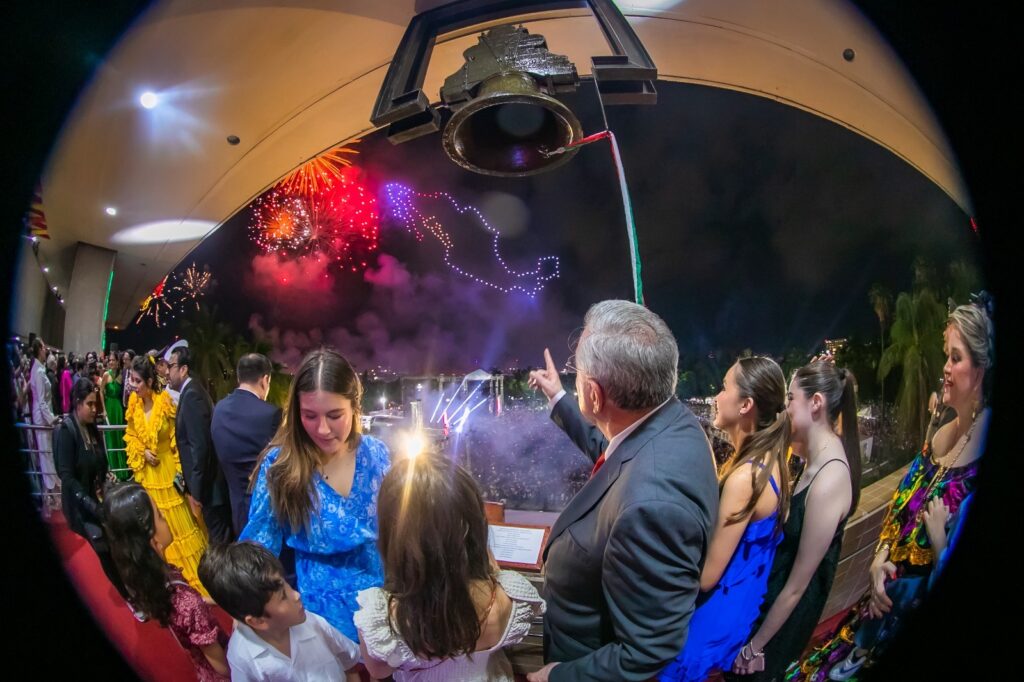 El gobernador Rocha permaneció junto con su familia e invitados especiales en el balcón para presenciar ambos espectáculos que llenaron de color el negro cielo, al son de las notas de un mariachi que sonaron por los altavoces.