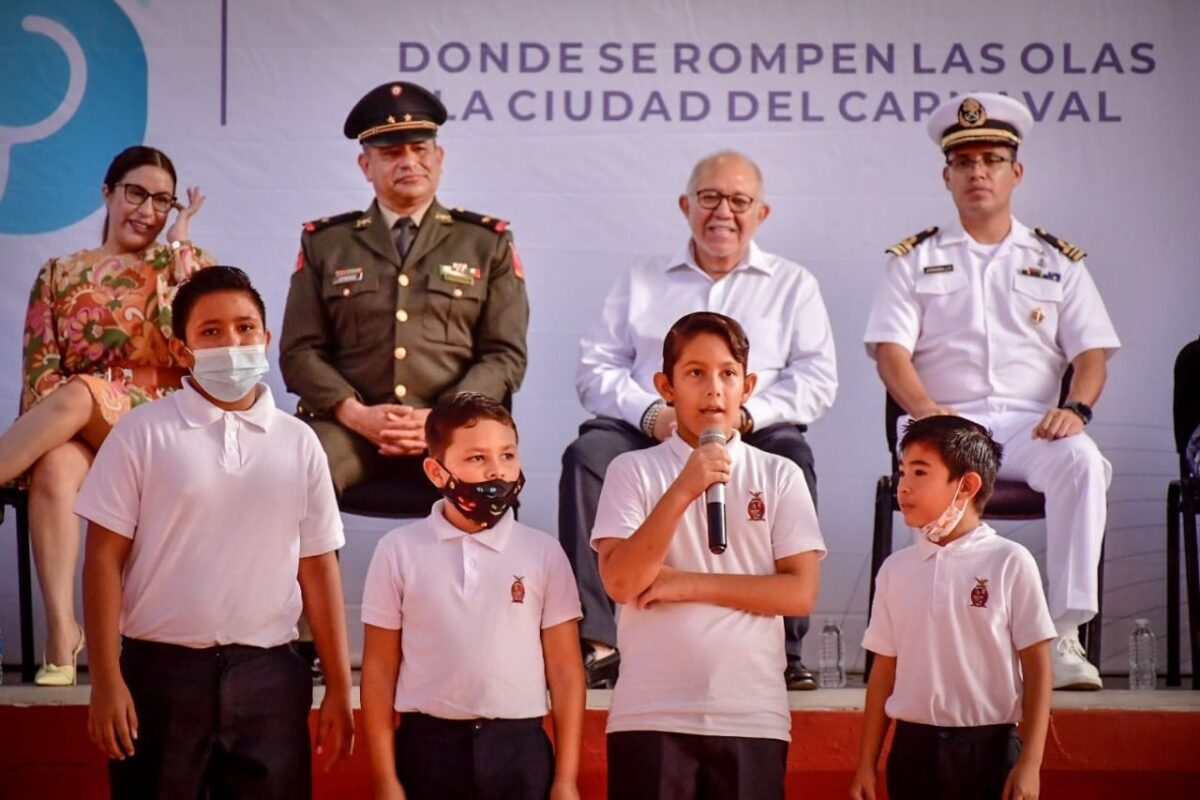 Durante la ceremonia cívica, el Presidente Municipal entregó a la Directora del plantel una bandera con su asta y material deportivo, además, los alumnos con excelencia académica recibieron un diploma y un pase para el Acuario Mazatlán.
