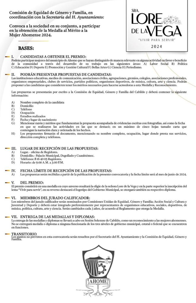 Los Mochis, Sinaloa.-La Comisión de Equidad de Género y Familia del Cabildo de Ahome, que preside la regidora Ofelia Rodríguez Morales, informó que la convocatoria para la obtención de la Medalla al Mérito a la Mujer Ahomense, “Lore de la Vega 2024”, se amplía hasta el mes de junio.