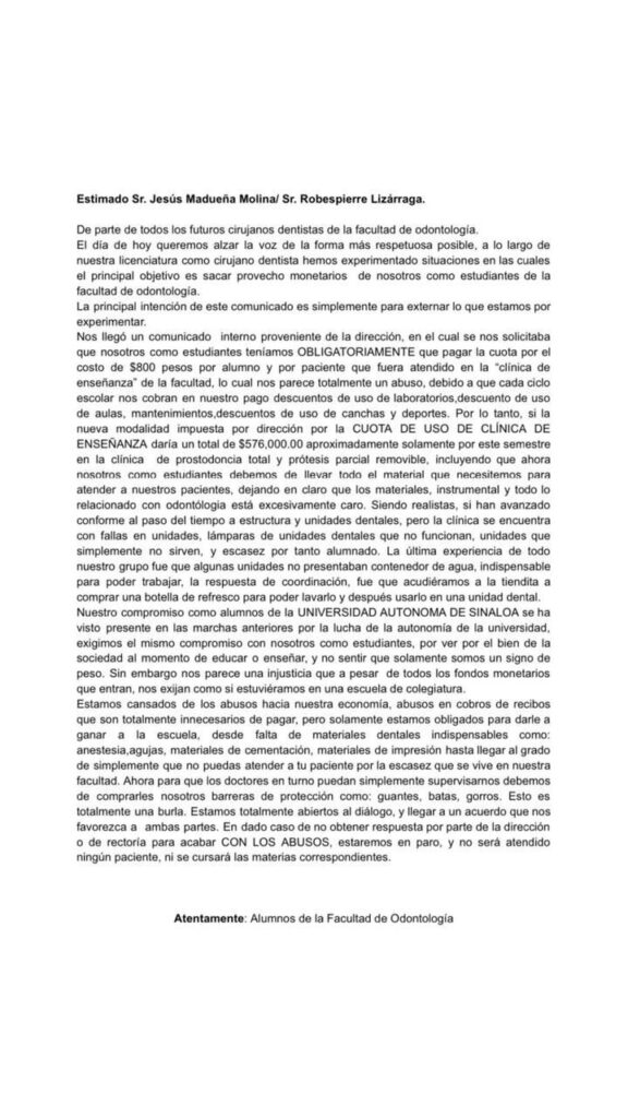 En un comunicado que hicieron circular alumnos de odontólogia, dirigen su queja tanto al rector separado de sus funciones, Jesús Madueña Molina, como al encargado del despacho de rectoría, Robespierre Lizárraga Otero, donde exponen una serie de cobros obligatorios por concepto de diversas cuotas que laceran la economía de los estudiantes y sus familias.