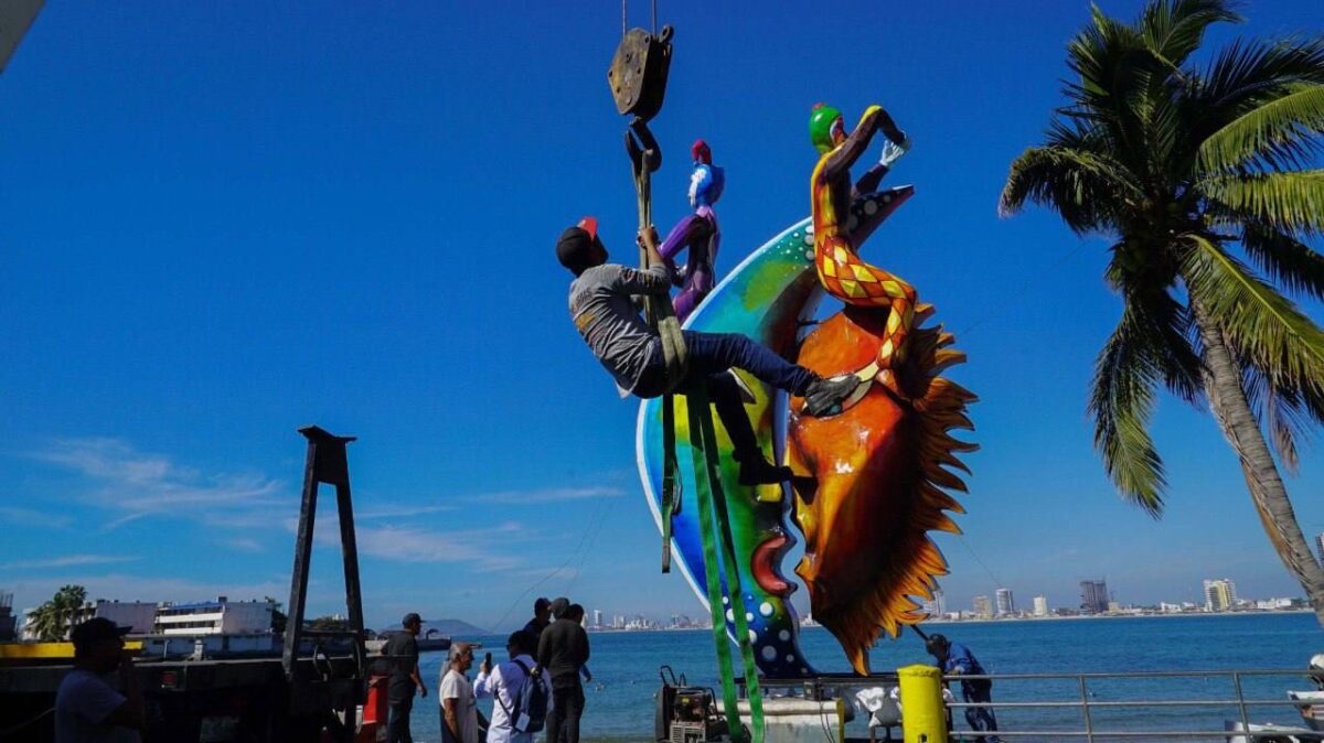 Mazatlán, Sinaloa, 15 de enero de 2024.- Hoy lunes 15 de enero sobre el malecón de Mazatlán a la altura del Monumento a la Pulmonía, la calle 5 de mayo y frente a lo que fue la disco Frankie Oh, quedaron instalados tres monigotes de “El Hijo de Neri”.