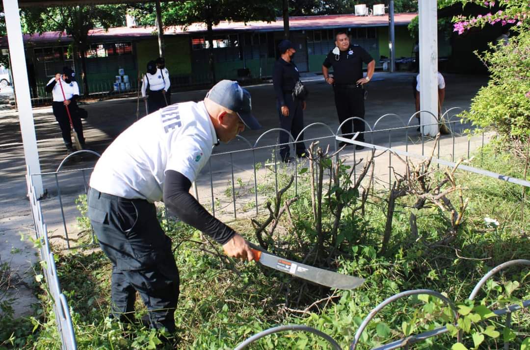 Mazatlán, Sinaloa.- En atención a las solicitudes de apoyo para la limpieza y rescate de planteles educativos, el Gobierno Municipal a través de la Secretaría de Seguridad Pública y Tránsito Municipal acudió este miércoles al Cobaes #38, ubicado en la colonia Casa Redonda.