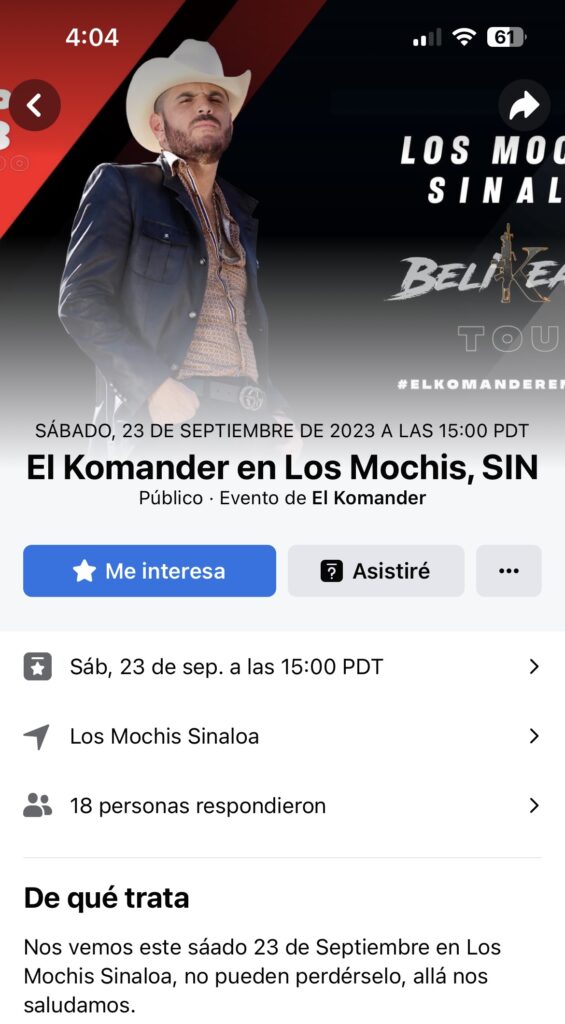 De acuerdo con la información recabada de la publicación del artista el concierto en los Mochis será el día sábado 23 de septiembre del presente año