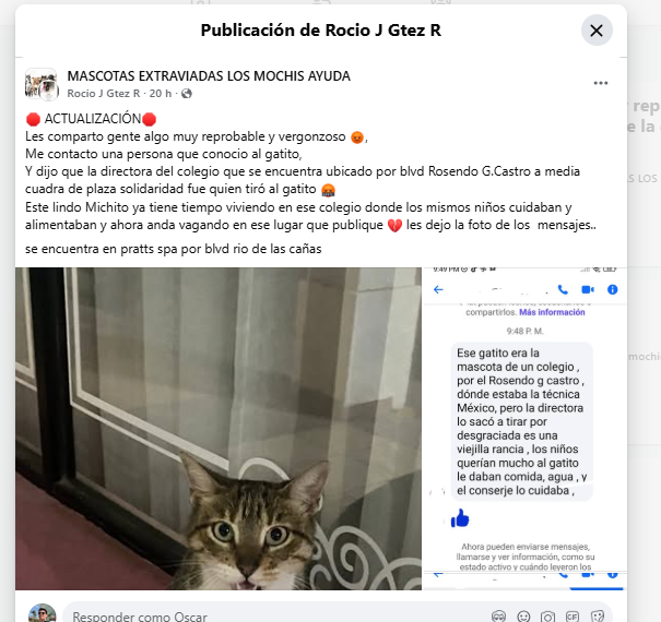 De acuerdo con la publicación realizada en un grupo de mascotas de Facebook, una persona que aseguró conocer al animal indicó que el felino vivía dentro del colegio, donde era alimentado y protegido por estudiantes, además de recibir cuidados por parte del personal de apoyo.