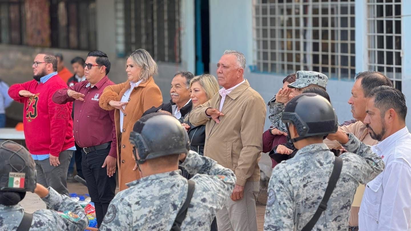 El presidente municipal de El Fuerte, Gildardo Leyva Ortega, acompañó la mañana de este lunes a la comunidad educativa de la Escuela Primaria Progreso, ubicada en la localidad de El Rincón de Aliso, durante la ceremonia del lunes cívico, en un acto que contó con la presencia del cuerpo de regidores y personal de la Guardia Nacional.