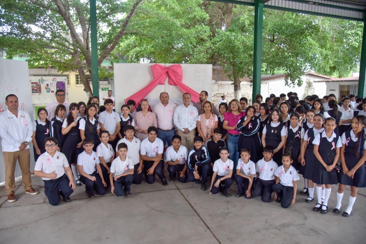 *El alcalde de Ahome encabezó el evento “Octubre Rosa, en nuestras manos”, acto conmemorativo en la Secundaria SNTE 1 Sección 53 Matutina, donde autoridades y estudiantes plasmaron sus huellas rosas como símbolo de esperanza y unidad en la prevención de esta enfermedad