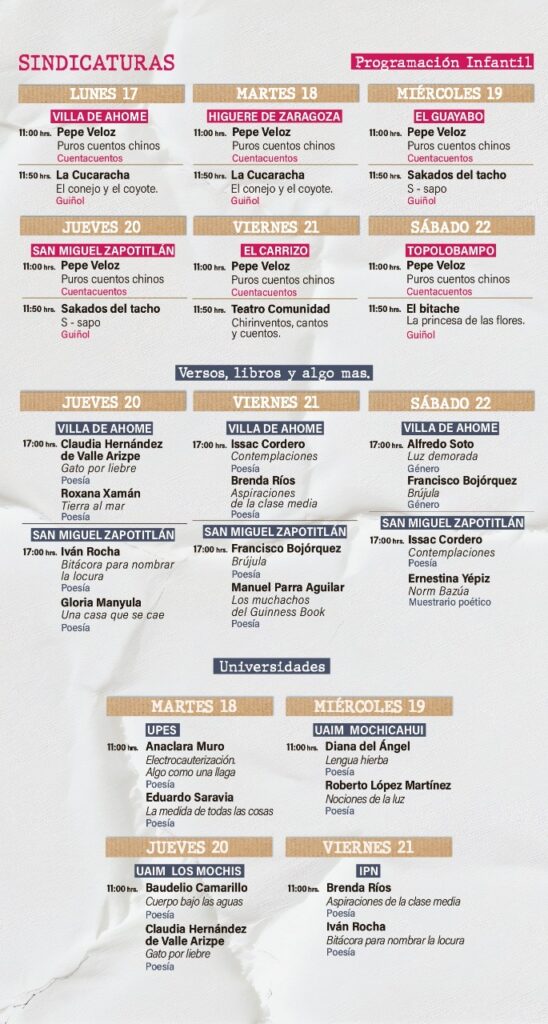 Las autoridades encargadas de brindar los detalles fueron María Teresa, directora del Instituto Municipal de Arte y Cultura de Ahome; María Ester Robles, regidora presidenta de la Comisión de Educación; Ernestina Yépis, directora de Literatura y Publicaciones; Alfonso Orejel, coordinador general de la Feria del Libro Los Mochis; Alejandro Brito, jefe de Servicios Regionales de SEPyC; Marta Eugenia Román, de la Dirección de Educación; Juan Gualberto Vázquez González, delegado de la zona norte del ISIC; y Baldomero Félix, de la Comisión de Actividades de la feria.