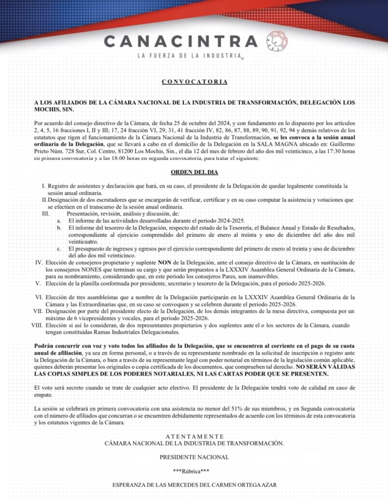 Los Mochis, Sinaloa. La Cámara Nacional de la Industria de Transformación (Canacintra) en Los Mochis ha lanzado su convocatoria para las elecciones del próximo periodo presidencial. Todos los afiliados interesados en participar tienen la oportunidad de presentar su planilla, la cual debe incluir las propuestas para presidente, secretario y tesorero.