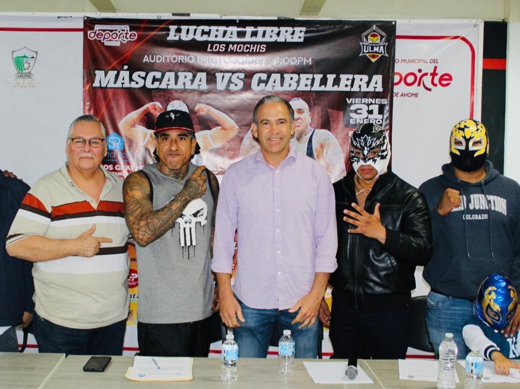 Los Mochis.- Los integrantes de la Unión de Luchadores del Municipio de Ahome (ULMA) en compañía de Autoridades Municipales abren temporada este 2025 dando a conocer los pormenores ante medios de comunicación de la primera Función de Lucha Libre con Causa “Mascara Vs Cabellera” programada para el viernes 31 de Enero en el Auditorio Benito Juárez a partir de las 8 de la noche en beneficio del Albergue para Ancianos Santa Rosa.