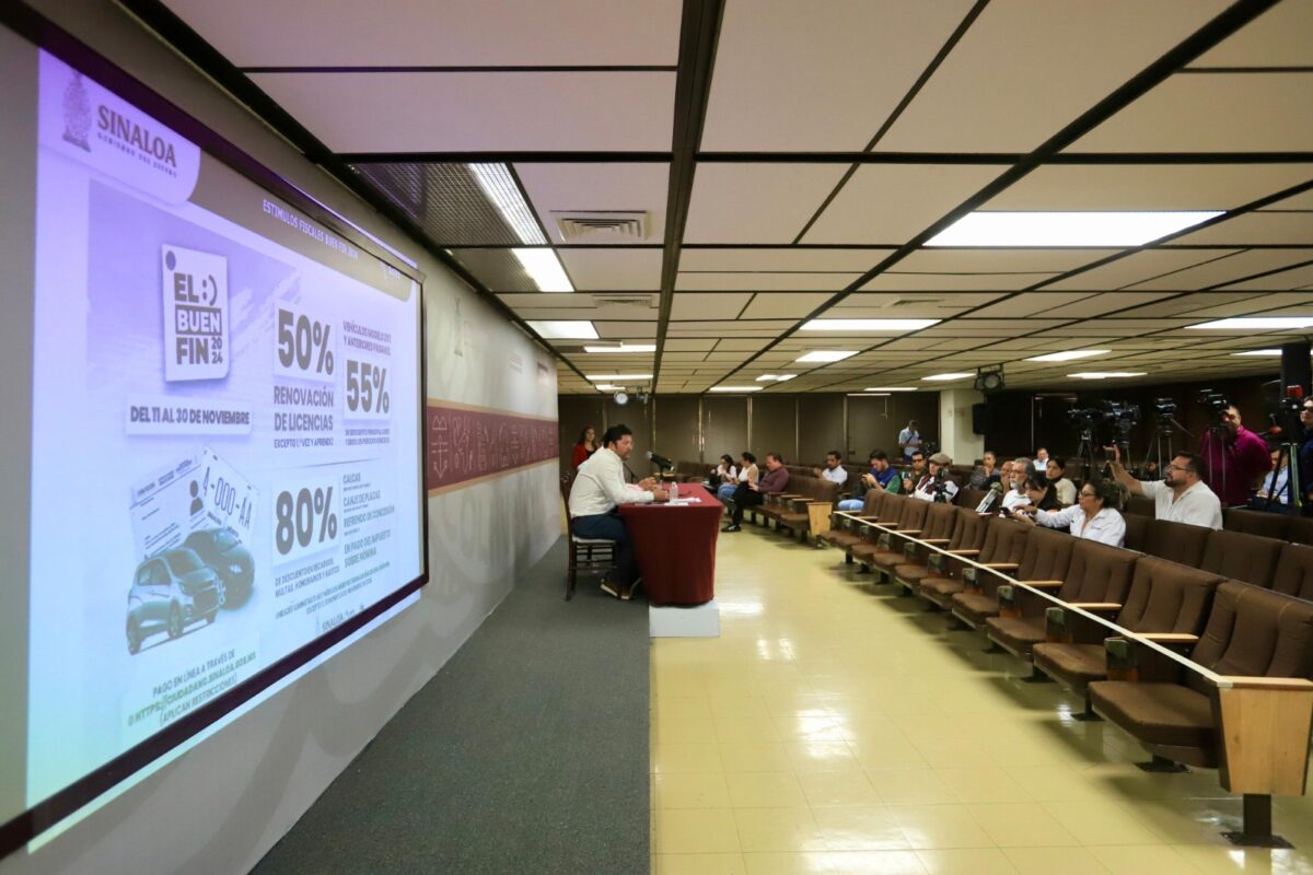 Culiacán, Sinaloa. jueves 07 de noviembre del 2024.- En conferencia de prensa presidida por el Secretario General de Gobierno y Vocero Estatal, Feliciano Castro Meléndrez, el Secretario de Seguridad Pública Gerardo Mérida Sánchez el Director General del SATES, Lic. José Carlos Cárdenas Mellado informó que el Buen Fin de Gobierno del Estado será del 11 al 30 de noviembre.