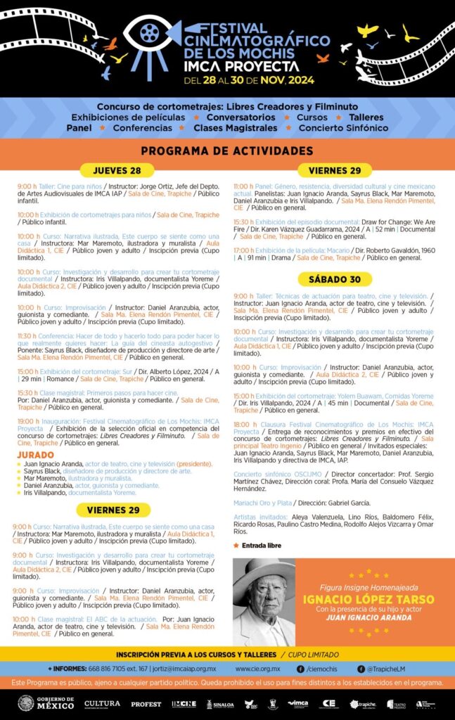 Dentro de las actividades se realizará un homenaje póstumo a Ignacio López Tarso, en donde se proyectará la versión restaurada de la película “Macario” protagonizada por el gran Ignacio López Tarso que se convirtió en la primer película mexicana que fue nominada a un premio Oscar, en la categoría a mejor película en Lengua Extranjera, en donde se contará con la presencia de su hijo, el actor Juan Ignacio Aranda donde al finalizar la película habrá retroalimentación con los comentarios de los presentes.