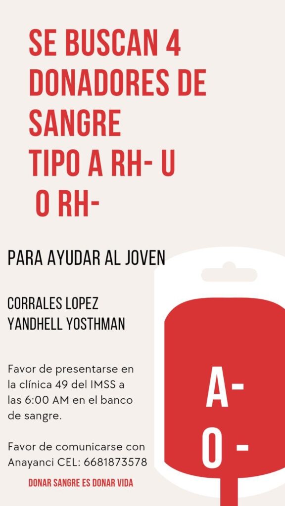 Los Mochis, Sinaloa.– Solicitan donadores de sangre para Yandhell Corrales quien a causa de un accidente la mañana del pasado martes 5 de noviembre el joven estudiante de 15 años fue aplastado entre dos camiones de pasajeros en un accidente de tránsito ocurrido en el bulevar Juan de Dios Bátiz, frente a la Preparatoria CBTis 43.