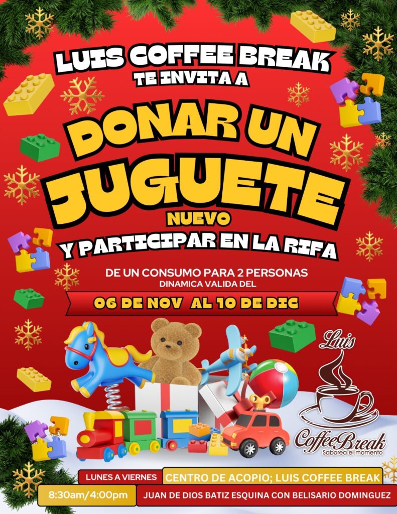 Los Mochis, Sinaloa.- Luis Coffee Break lanza una campaña de donación de juguetes nuevos, ofreciendo a los participantes la oportunidad de ganar una experiencia de consumo para dos personas en una rifa.