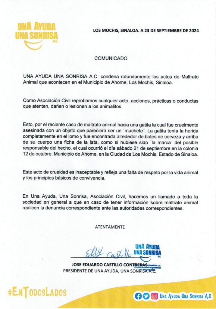 Los Mochis, Sinaloa. – La asociación civil Una Ayuda, Una Sonrisa A.C. expresó su total condena ante los recientes actos de maltrato animal registrados en el municipio de Ahome, Sinaloa.