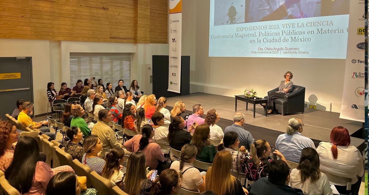 Los Mochis, Sinaloa.- La Dra. Ofelia Angulo Guerrero en la décimo sexta edición de ExpoGenios 2023 bajo el lema “viviendo la ciencia” impartió la “Conferencia Magistral Políticas Públicas en Materia Científica en la Ciudad de México” en las instalaciones de CIE Los Mochis, en donde asistieron alumnos de diferentes escuelas de Los Mochis, como el Colegio de Bachilleres, Instituto Piaget, Instituto Tecnológico de Los Mochis, Cetis 68, Cbtis 43, Universidad Autónoma de Occidente, Universidad Pedagógica.