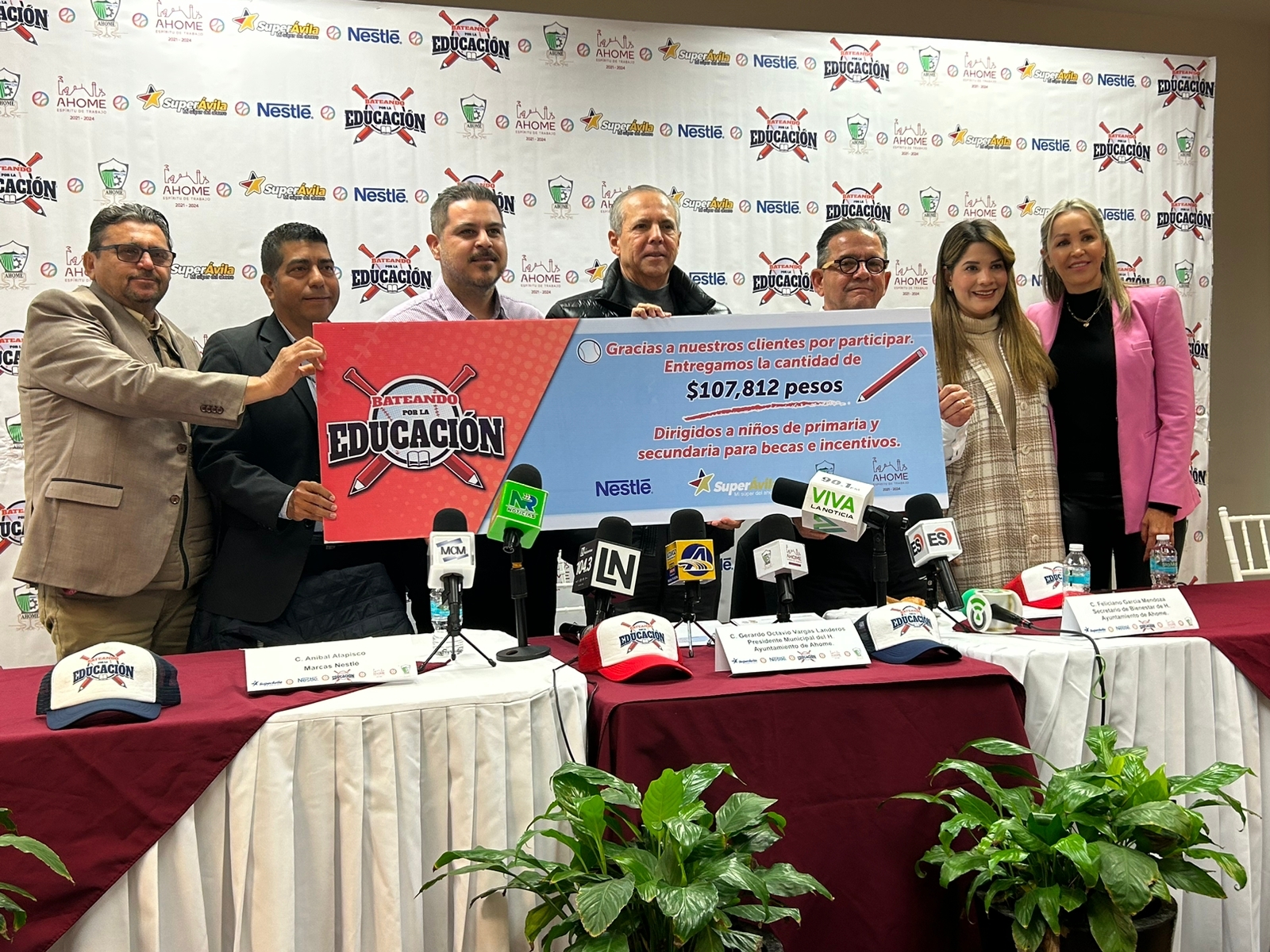 Los Mochis, Sinaloa.- Esta tarde en el salón cabildo en una rueda de prensa en presencia del presidente Municipal de Ahome Gerardo Octavio Vargas Landeros en compáñia del secretario de bienestar Feliciano García Mendoza, la sindica procuradora Cecilia Hernández Flores, la directora de bienestar Ana Maria Bojorquez Alvarez, el representante de grupo «Nestlé» Aníbal Alapisco, el director de operaciones de «Super Ávila» y el director de educación Sixto Rosas Hernández presentaron el programa «Bateando por la educación», este este evento consiste en que la empresa «Nestlé» a través de «Super Ávila» realizan un donativo para el ayuntamiento de Ahome.