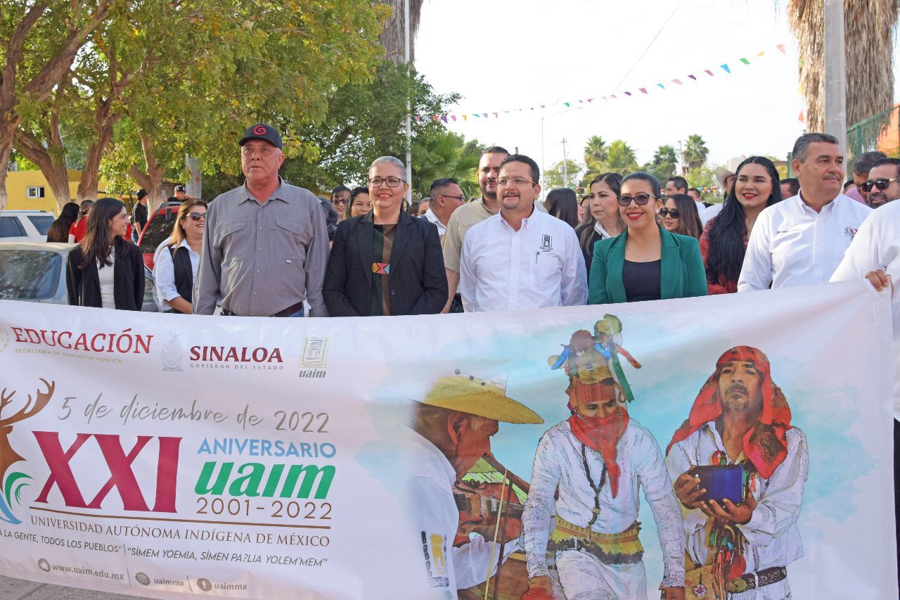 El Fuerte, Sinaloa, a 05 de diciembre del 2022.- El Alcalde Gildardo Leyva Ortega y parte de su equipo de trabajo, asistieron esta mañana a la celebración del XXI aniversario de la Universidad Autónoma Indígena de México, evento al cual también hizo acto de presencia la Titular de la Secretaria de Educación Pública y Cultura del Estado de Sinaloa, Graciela Domínguez Nava, en representación del Gobernador Rubén Rocha Moya.