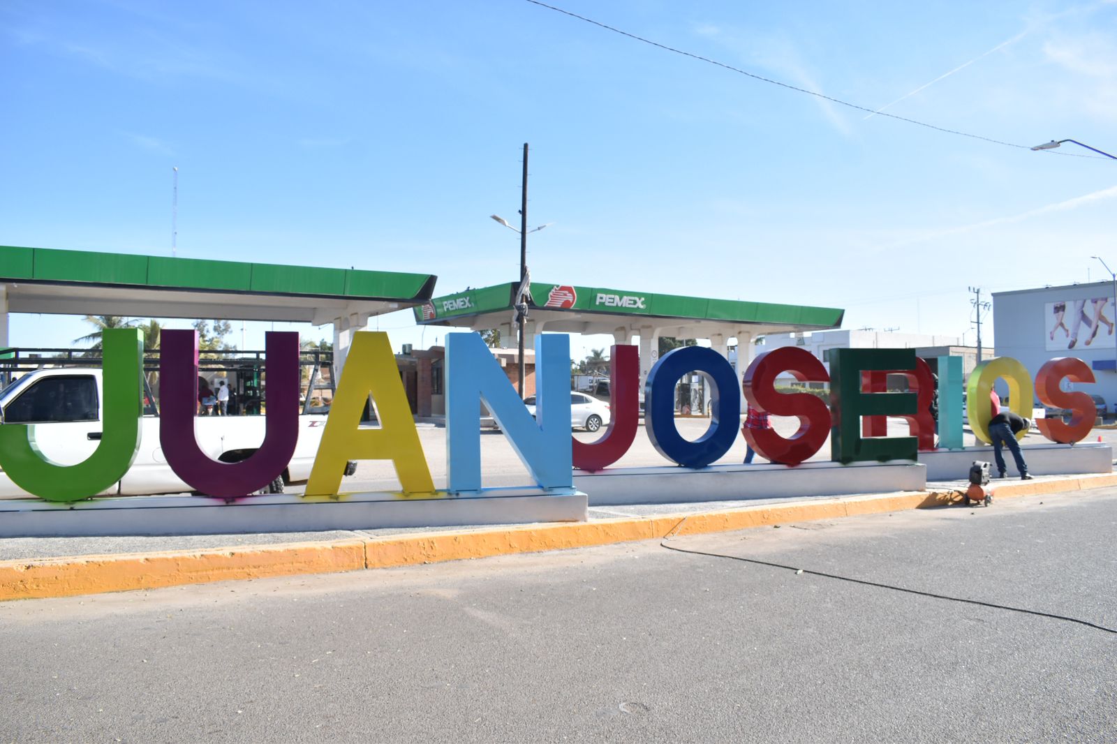 Juan José Ríos, Sinaloa.- Un comité de ciudadanos se unió para cooperar, hacer kermeses, rifas y patrocinios para poder instalar estas letras emblemáticas de Juan José Ríos.