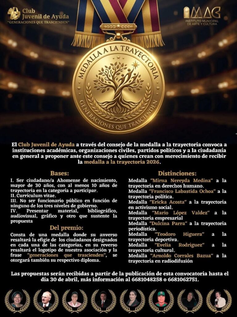Los Mochis, Sinaloa.- Con el objetivo de reconocer a ciudadanos que han dejado una huella positiva en la sociedad, el Club Juvenil de Ayuda, en coordinación con el Instituto Municipal de Arte y Cultura (IMAC), lanzó la convocatoria para la Medalla a la Trayectoria “Generaciones que Trascienden” 2026.