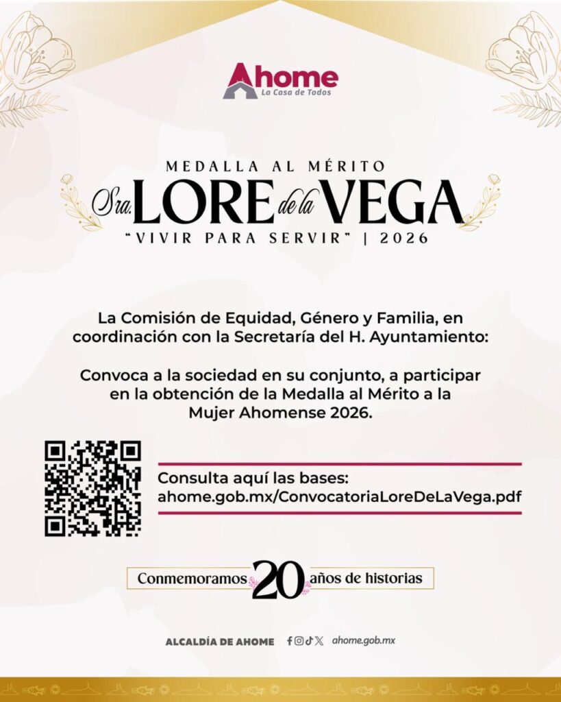 Los Mochis, Ahome, Sinaloa, a 06 de febrero del 2026.- Con el objetivo de reconocer a mujeres ahomenses que se distinguen por su desempeño ante la sociedad en diversos ámbitos de la vida social comunitaria, el Gobierno Municipal a través de la Comisión de Equidad, Género y Familia del Cabildo, convoca a participar en el Premio al Mérito de la Mujer Ahomense “Lore de la Vega, Vivir para Servir 2026”.
