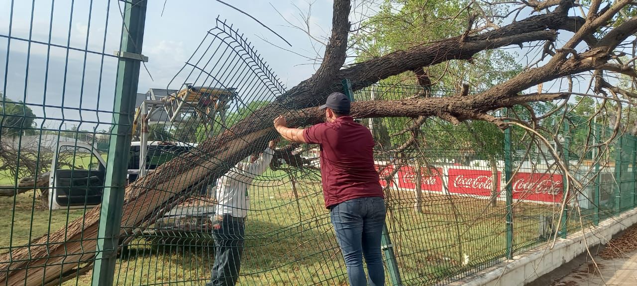En otra acción en beneficio del deporte ahomense, el equipo de trabajadores encabezados por Caín Cossío Saiz se dio a la tarea de retirar un árbol caído, para posteriormente cumplir con la reparación de la cerca perimetral dañada en la Ciudad Deportiva Aurelio Rodríguez Ituarte.
