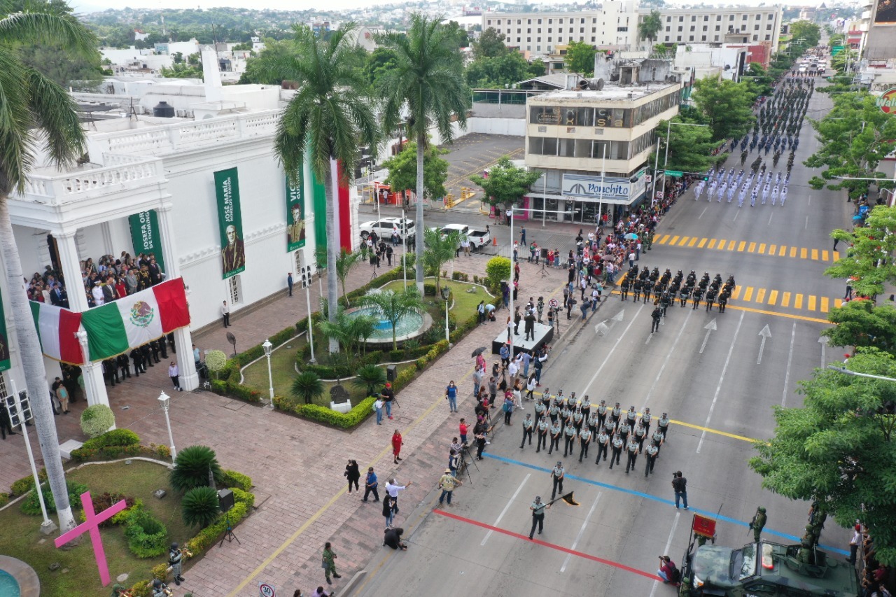 Los contingentes de bandas de guerra y escoltas de diferentes organismos militarizados, así como también de centros educativos de la capital que transitaban por la avenida Obregón, con el más alto honor hacían muestra del Lábaro Patrio como símbolo de independencia.