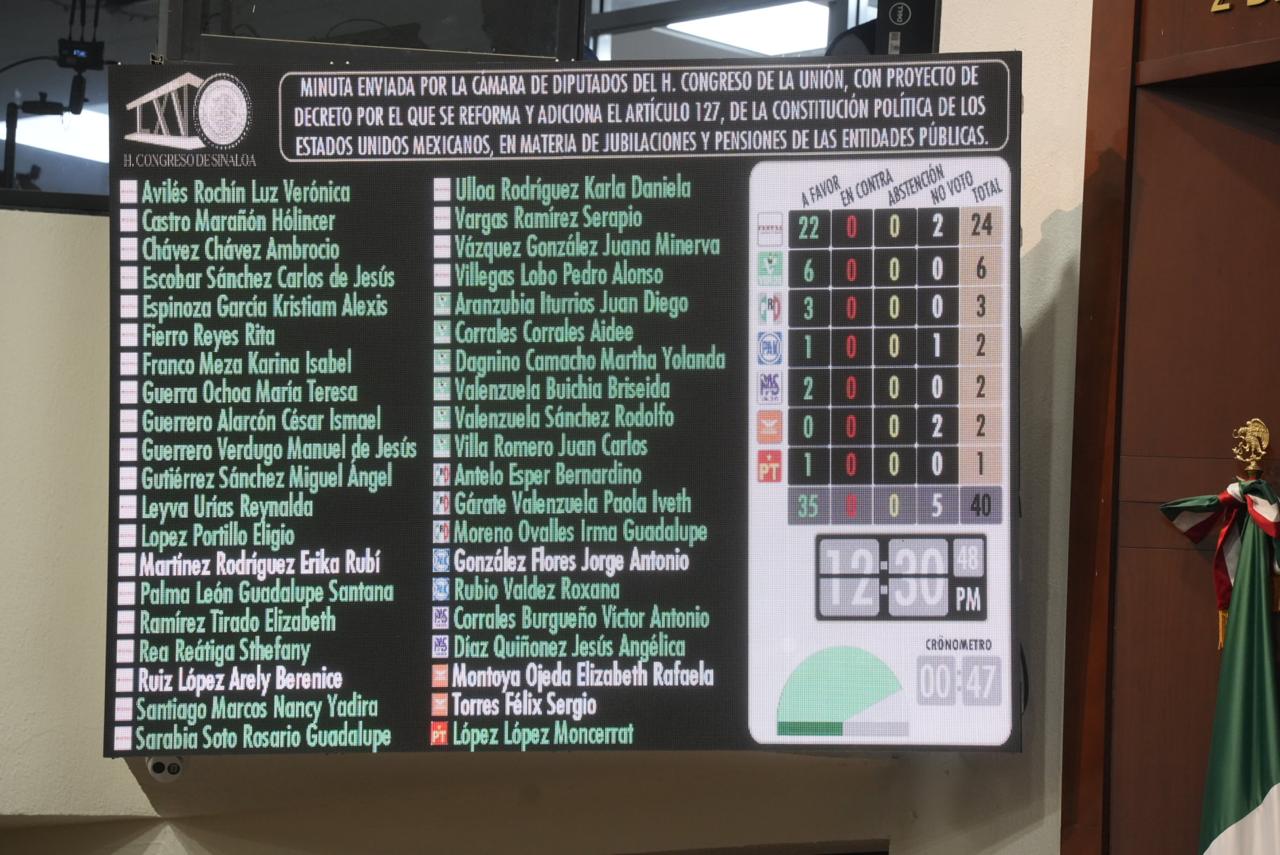 Culiacán, Sinaloa. A 26 de marzo de 2026.- El Congreso del Estado de Sinaloa aprobó en Sesión Extraordinaria y por unanimidad minuta enviada por la Cámara de Diputados del Congreso de la Unión que contiene Decreto que reforma el artículo 127 Constitucional y que prohíbe que toda persona del servicio público tenga una pensión cuyo monto exceda la mitad de la remuneración establecida para la persona titular del Ejecutivo federal.