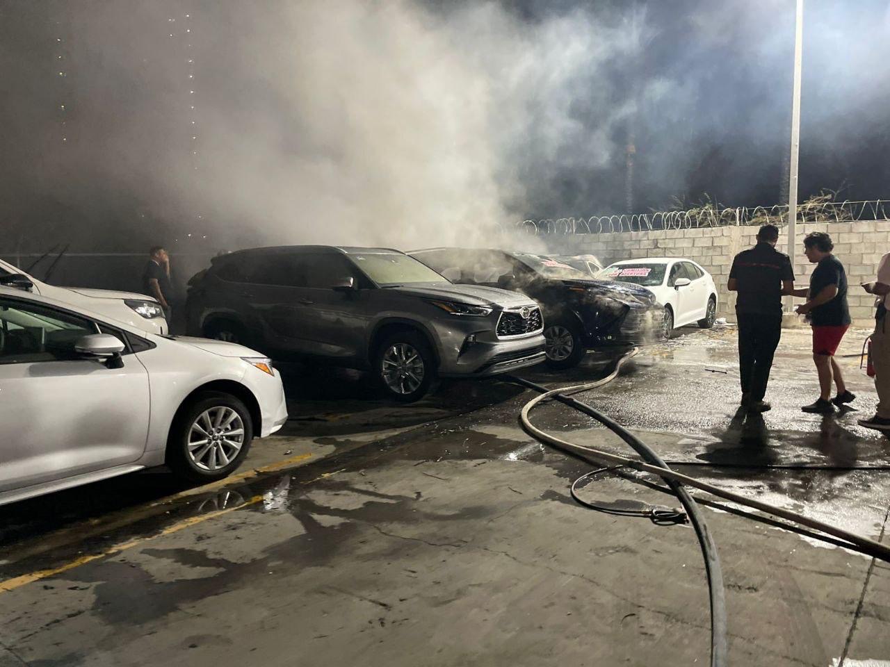Elementos del Cuerpo de Bomberos, Protección Civil y de la Secretaría de Seguridad Pública Municipal acudieron al llamado y trabajaron de manera coordinada para sofocar el fuego, el cual en cuestión de minutos se extendió hacia el patio trasero de una agencia automotriz, donde se encontraban vehículos resguardados.