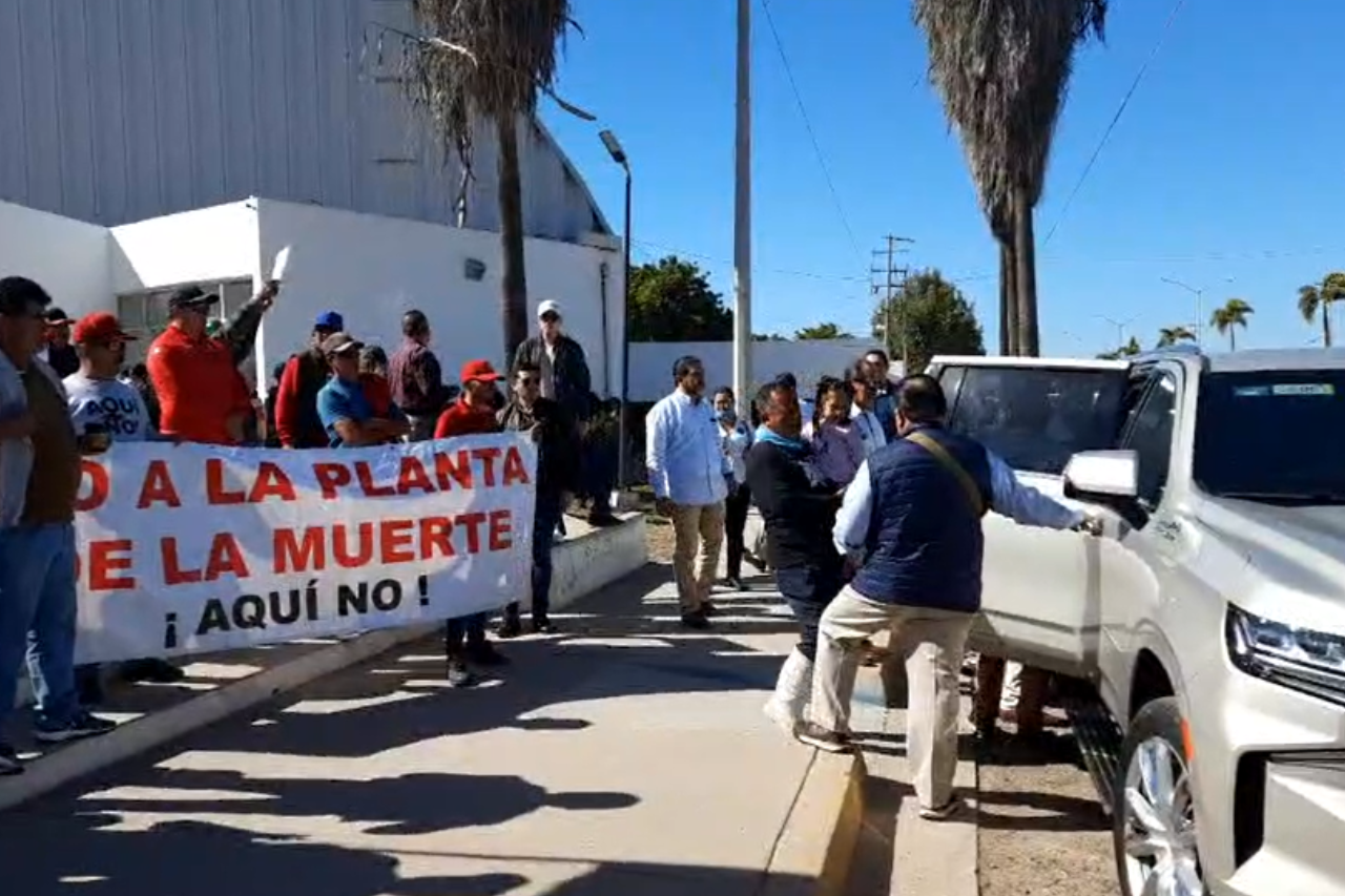 Con pancartas y gritos «Nunca vamos a permitir esa planta de amoníaco», los protestantes encararon al Gobernador de Sinaloa, Ruben Rocha Moya.