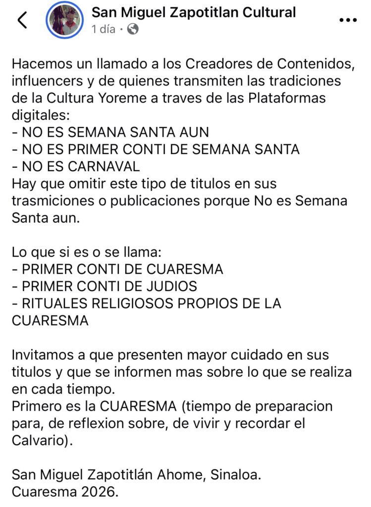 Los promotores culturales subrayaron que la Cuaresma es un tiempo de reflexión y preparación espiritual dentro de la tradición yoreme, por lo que exhortaron a quienes difunden contenido digital a informarse con mayor profundidad y mostrar respeto por el significado de estas prácticas.