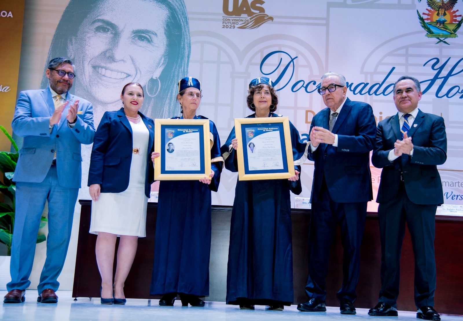 La Universidad Autónoma de Sinaloa (UAS) se vistió de gala y, en un marco de celebración sin precedentes, entregó su más alto reconocimiento: el Doctorado Honoris Causa a la Doctora Annie Pardo Cemo y a la Doctora Rosaura Ruiz Gutiérrez, dos mexicanas sobresalientes por su inteligencia e inspiradoras por su tenacidad, liderazgo y calidad moral.