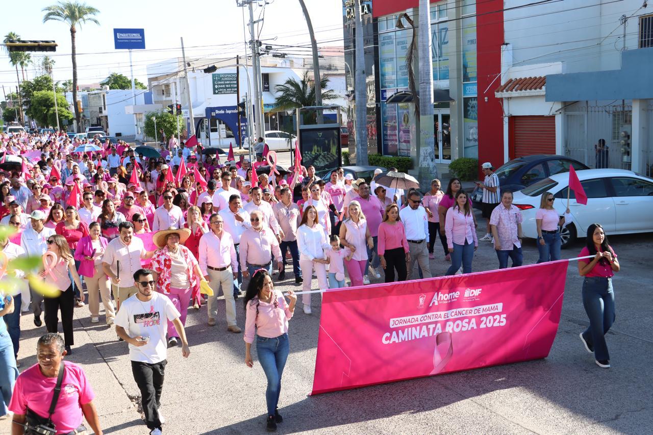 Los Mochis, Ahome, Sinaloa. A 17 de Octubre de 2025.- En el marco del Día Mundial de la Lucha contra el Cáncer de Mama, que se conmemora el 19 de octubre, el Gobierno Municipal de Ahome y el Sistema DIF Ahome realizaron la Marcha Rosa 2025. La emotiva caminata fue encabezada por Cutberto Ríos Beltrán, Secretario del Ayuntamiento, en representación del Alcalde Antonio Menéndez De Llano Bermúdez, y por Marissa Menéndez De Llano Chávez, Presidenta del Sistema DIF Ahome.