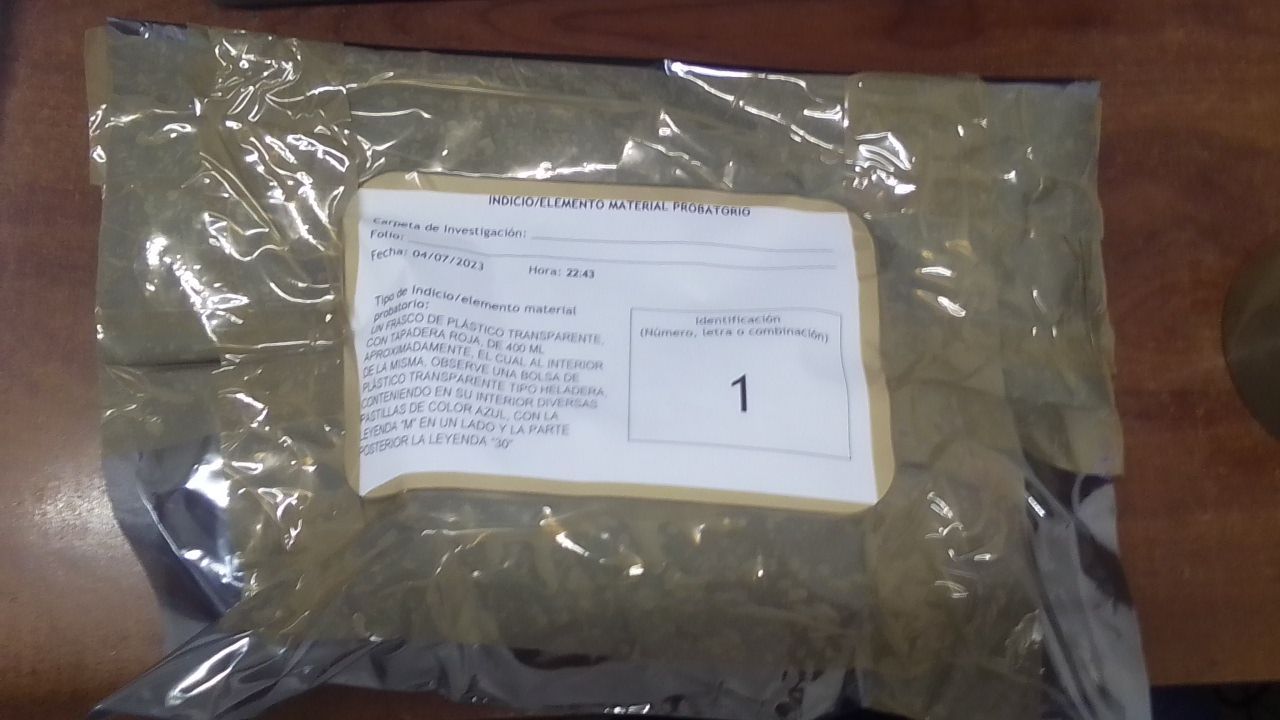 El personal policial preventivo, de inmediato intervino para checar dicho objeto, y confirmó que contenía en su interior una bolsa de plástico tipo heladera con diversas pastillas de color azul con las características propias del fentanilo.