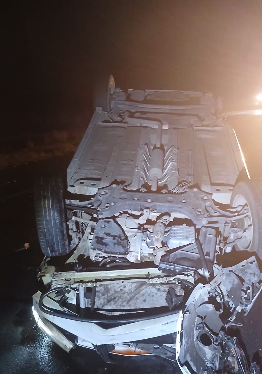 Al arribar al lugar, los elementos de seguridad localizaron un vehículo sedán marca Chevrolet, línea Aveo, color blanco, modelo 2020, con placas del estado de Sinaloa, el cual se encontraba volcado sobre la carretera e invadiendo ambos carriles, con los neumáticos hacia arriba.