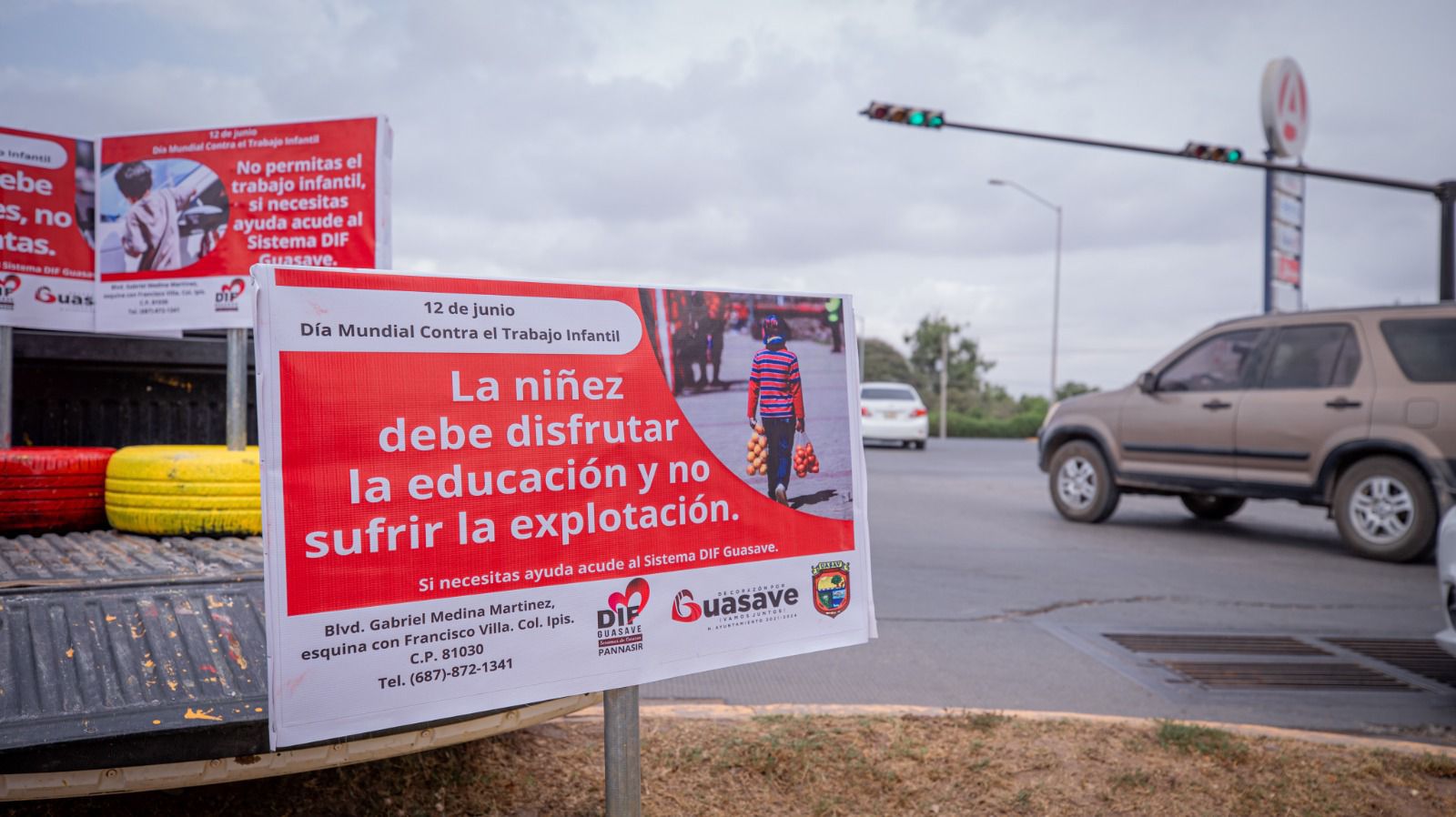 Guasave, Sinaloa.- Como parte de la campaña estatal Juega Tu Papel, el Sistema DIF Guasave instala mensajes preventivos contra el trabajo infantil en 17 cruceros de la ciudad, con el fin de concientizar a la población sobre este problema social y generar oportunidades para los niños.