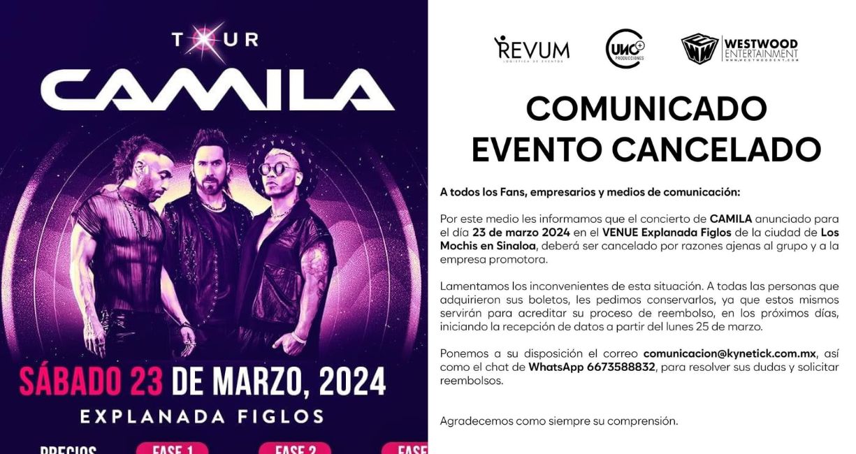 La organización atribuyó la cancelación con el siguiente mensaje: “Por este medio les informamos que el concierto de CAMILA anunciado para el día 23 de marzo 2024 en el VENUE Explanada Figlos de la ciudad de Los Mochis en Sinaloa, deberá ser cancelado por razones ajenas al grupo y a la empresa promotora”