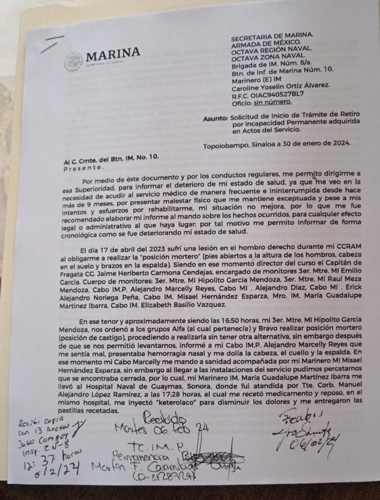De acuerdo con el testimonio de su hermana, Miriam Ortiz Álvarez, Caroline resultó lesionada mientras participaba en el Curso de Capacitación para Reclutas de la Armada de México (CCRAM), realizado en Guaymas, Sonora, donde asegura se le exigió adoptar una posición física que actualmente ya no está permitida por el desgaste que genera en los aspirantes.