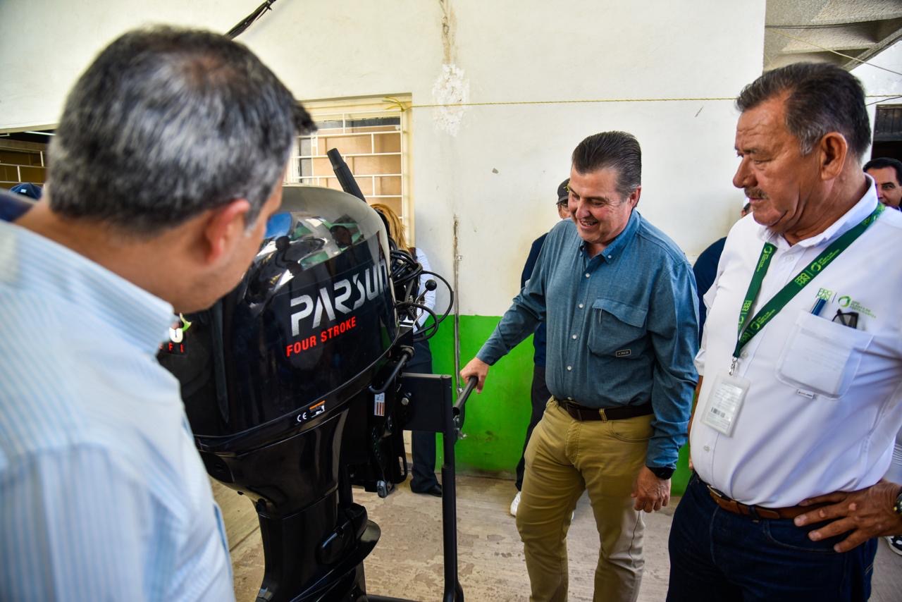 Los Mochis, Ahome, Sinaloa. A 24 de Abril del 2025.- Pescadores integrados en la Federación Regional de Sociedades Cooperativas de la Industria Pesquera del Norte de Sinaloa y Sur de Sonora, recibieron apoyos del Programa de incentivos del Gobierno para la adquisición de motores marinos en convenio con la Comunidad.