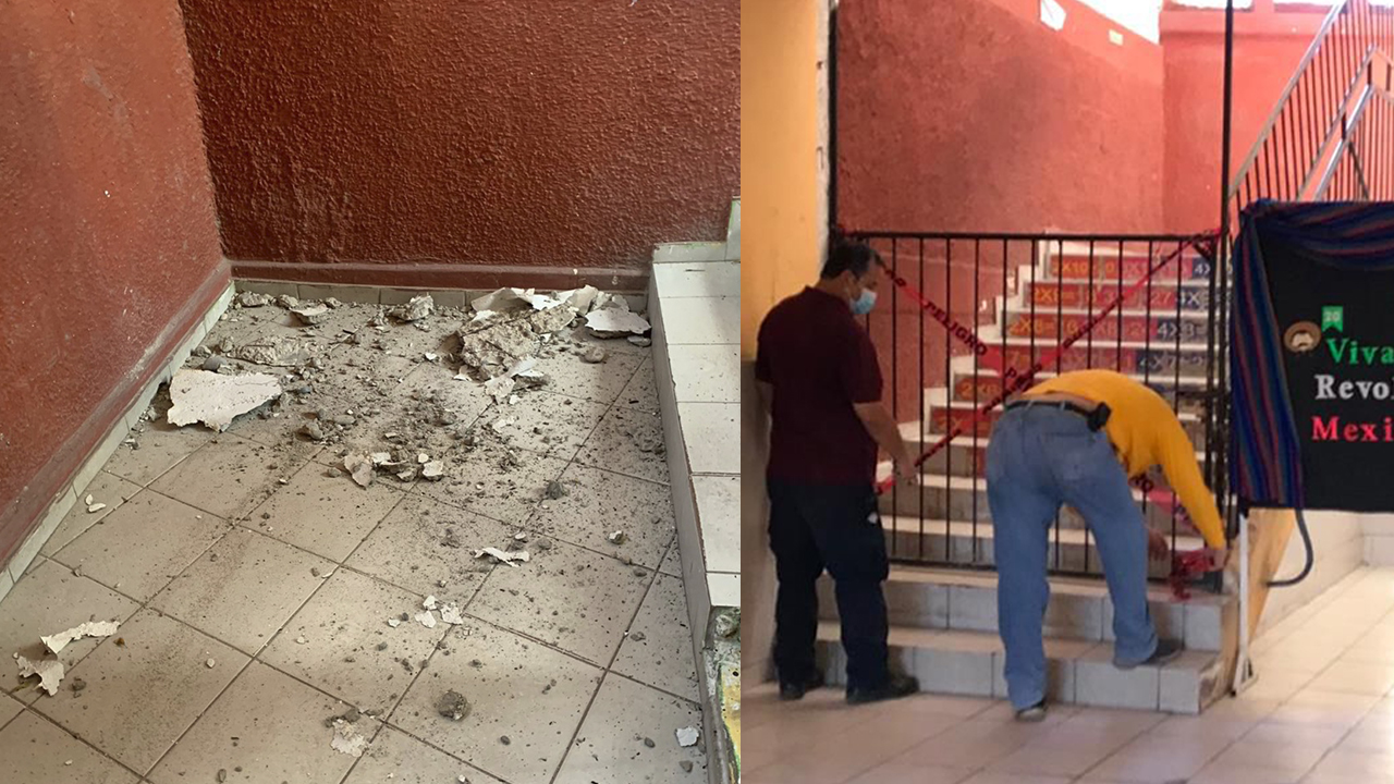 De acuerdo a la directora Bitza Edith Medina López elementos de Protección Civil clausuraron en días pasados la planta alta del plantel debido a que se cayó el enjarre del techo de las escaleras y las varillas quedaron descubiertas, teniendo que ofrecer clases presenciales bajo los arboles y en los patios.