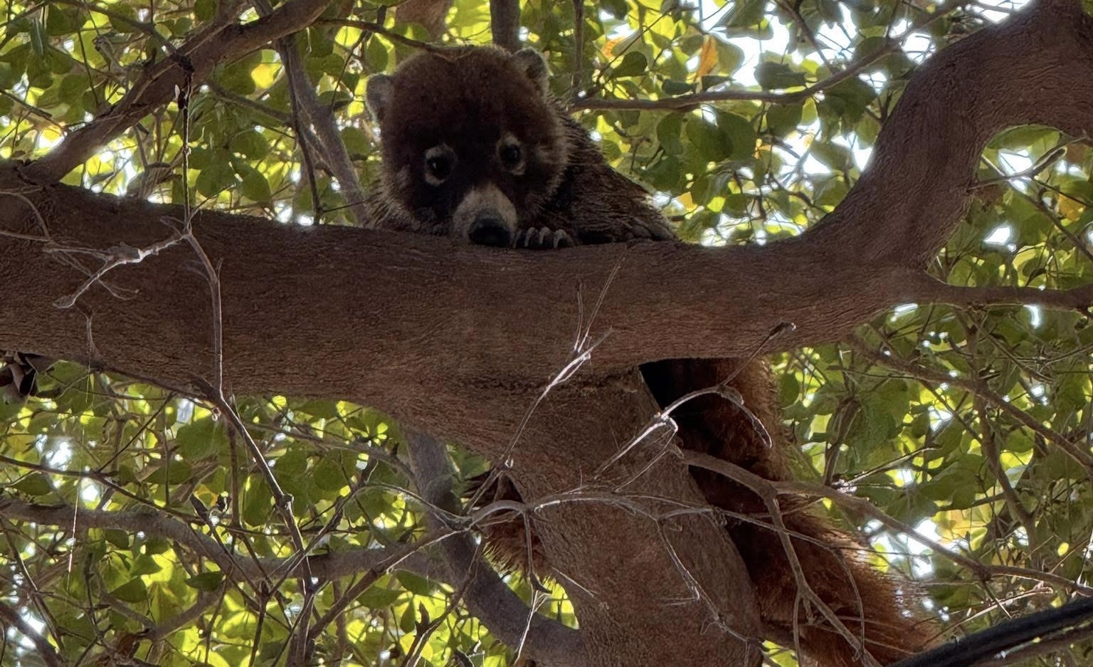 Los Mochis, Sinaloa.– A través de redes sociales, un ciudadano reportó la presencia de un animal silvestre que se refugió en el árbol de su vivienda, aparentemente tras asustarse por la presencia de perros.