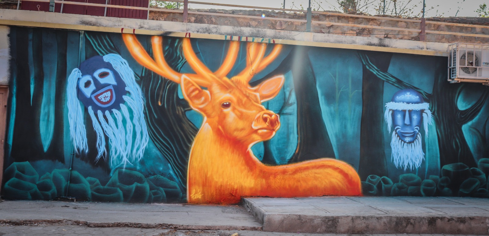 El primer mural lleva por nombre Mazoyeye, que significa danza del venado, la idea nace de la perspectiva de la Arq. Claudia Castañeda, el objetivo fue realizar una obra donde se consideraran personajes con carga social para el municipio, como son la danza del venado y los pascolas, además que este pudiera integrarse a los propios elementos que lo rodean. Este mural se encuentra en la Escuela Primaria Club de Leones, en el participaron, los pintores locales Omar Delval, Sadrac López, Juan Jiménez y Tony Trasviña.