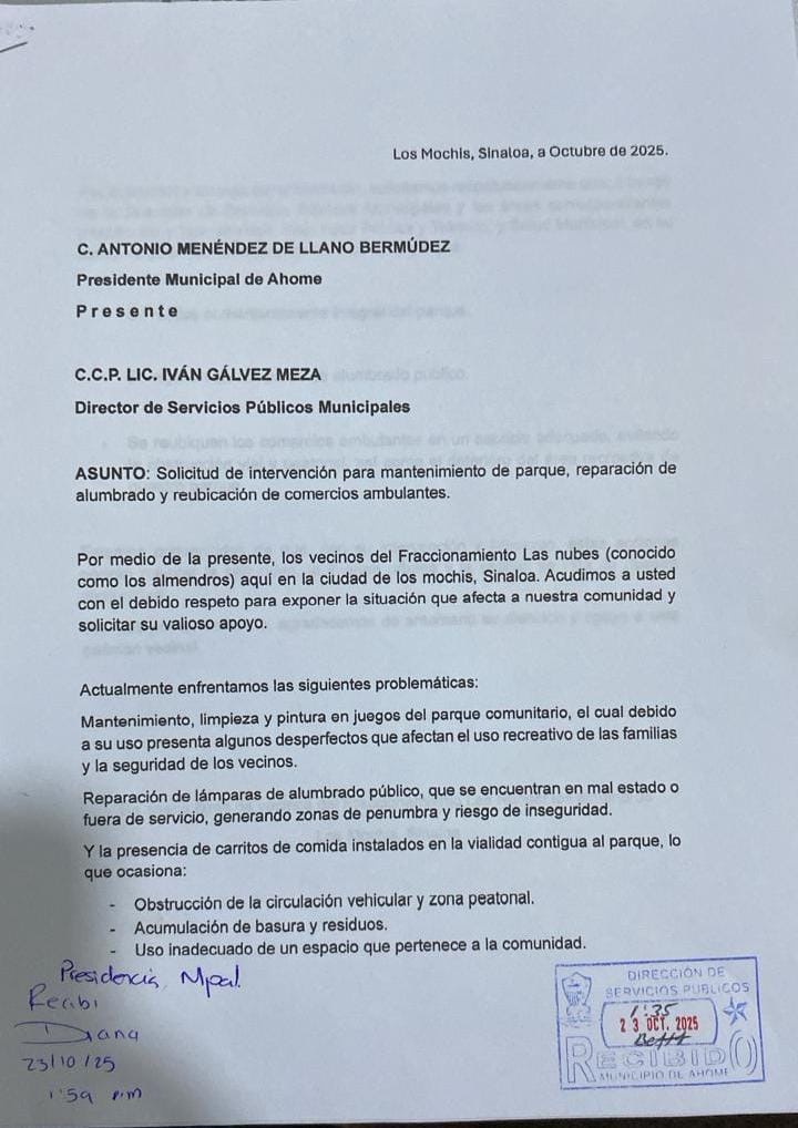 “Por medio de la presente, los vecinos del fraccionamiento Las Nubes (conocido como Los Almendros), aquí en la ciudad de Los Mochis, Sinaloa, acudimos a usted con el debido respeto para exponer la situación que afecta a nuestra comunidad y solicitar su valioso apoyo.